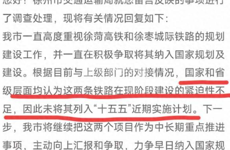 “徐菏高铁、徐枣城际铁路虽已纳入相关规划研究,但因紧迫性不足,暂未列入‘十五五’(2026–2030年)近期实施项目。”